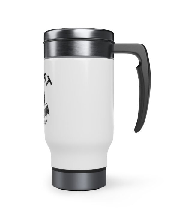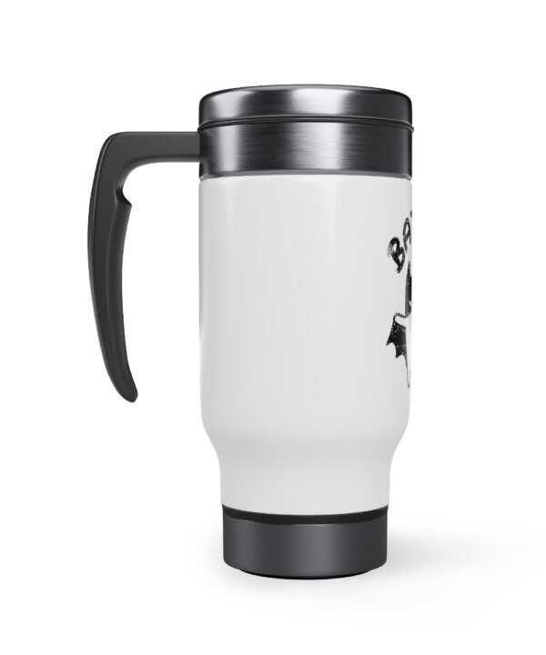 Get ready to stay hydrated and stylish on the go with our new Bat Cat Designed Stainless Steel Travel Mug with Handle! This 14 oz travel mug is perfect for coffee, tea, or any other beverage you prefer. The sleek stainless steel material keeps your drink hot or cold for hours, making it perfect for busy mornings or long commutes.