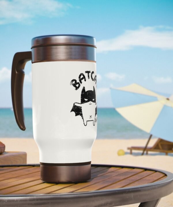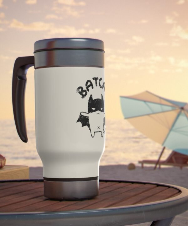 Get your CatBat Designed Stainless Steel Travel Mug with Handle from Smol Wear today and stay hydrated in style. Not only you’ll be supporting an independent artist and a small business, but also you’ll have a unique and high-quality travel mug for your daily needs.