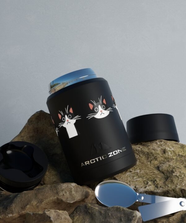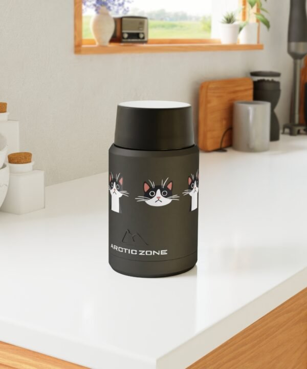 Take your meals on the go in style with a Black Titan Copper Insulated Food Storage container from Smol Wear. Designed with a playful cat doodle and featuring a sleek black color, this container is the perfect accessory for all your adventures. Made with robust stainless steel and featuring high-end copper insulation, this container will keep your food hot for up to 8 hours or cold for up to 24 hours. With a capacity of 16.9oz (500ml), you’ll have plenty of room to bring along your favorite meals, snacks, or drinks. And with its foldable metal spoon, you’ll always have a utensil on hand. Whether you’re heading out for a hike, a picnic, or a day at the office, this insulated container is a must-have. So why wait? Get your hands on a Black Titan Copper Insulated Food Storage container from Smol Wear today and enjoy your meals wherever you go!